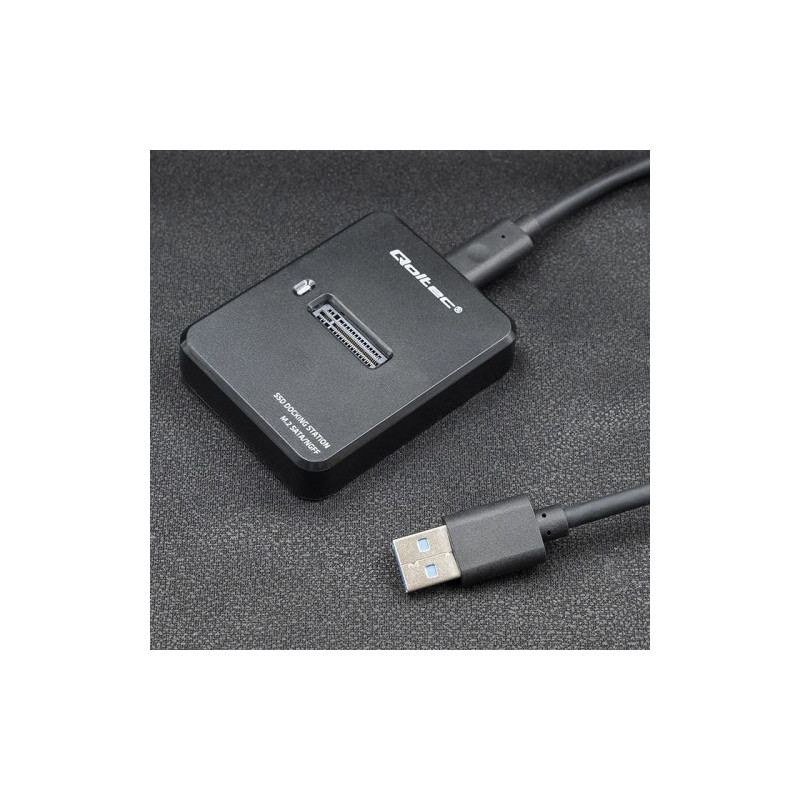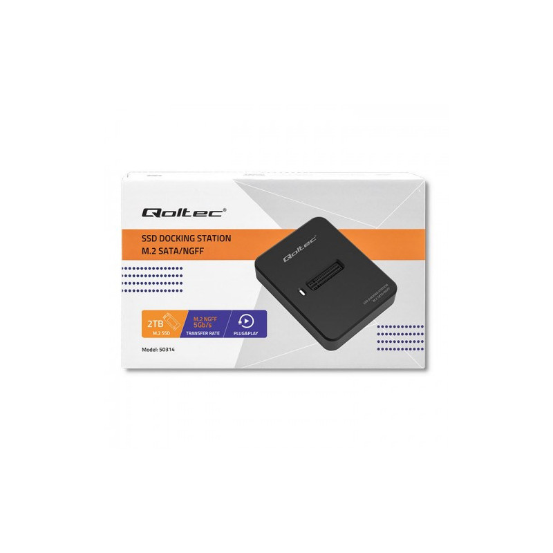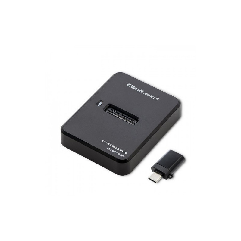 The Qoltec SSD docking station supports M.2 SATA drives with lengths of 30, 42, 60 and 80 mm. It has a USB Type-C connector with USB 2.0/3.2 Gen 1 support and can accommodate one storage drive.