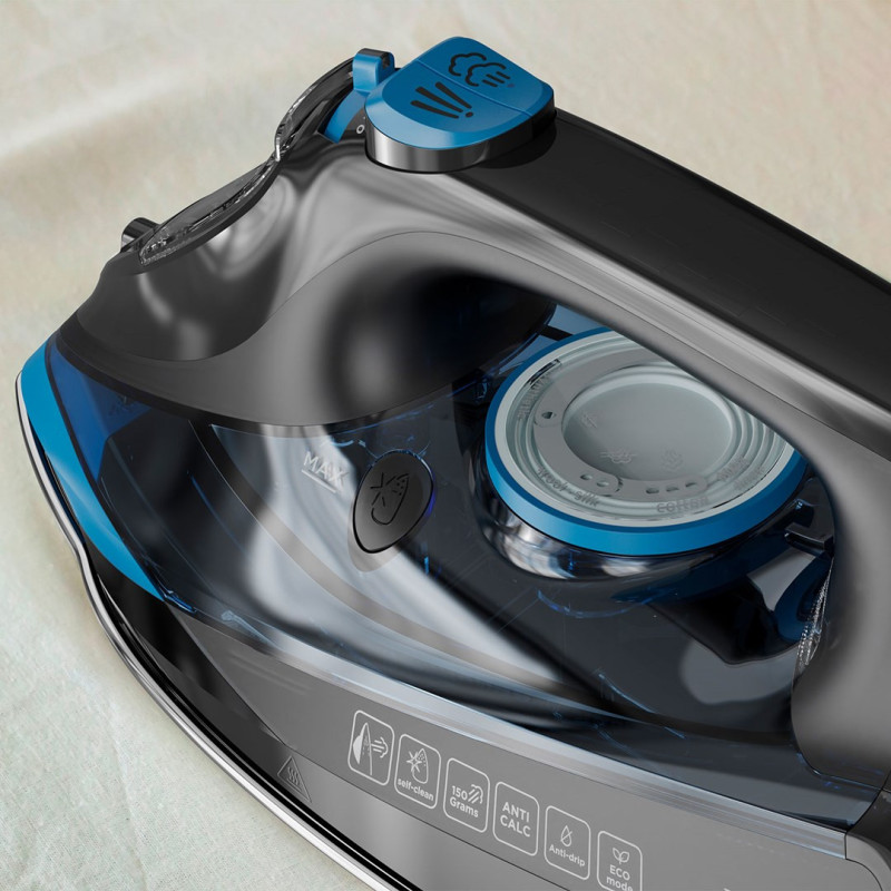 The iron with a 0.36 L water tank produces a continuous 150 g/min steam, ensuring efficient ironing, while the cerium soleplate and automatic anti-calc function guarantee durability.
