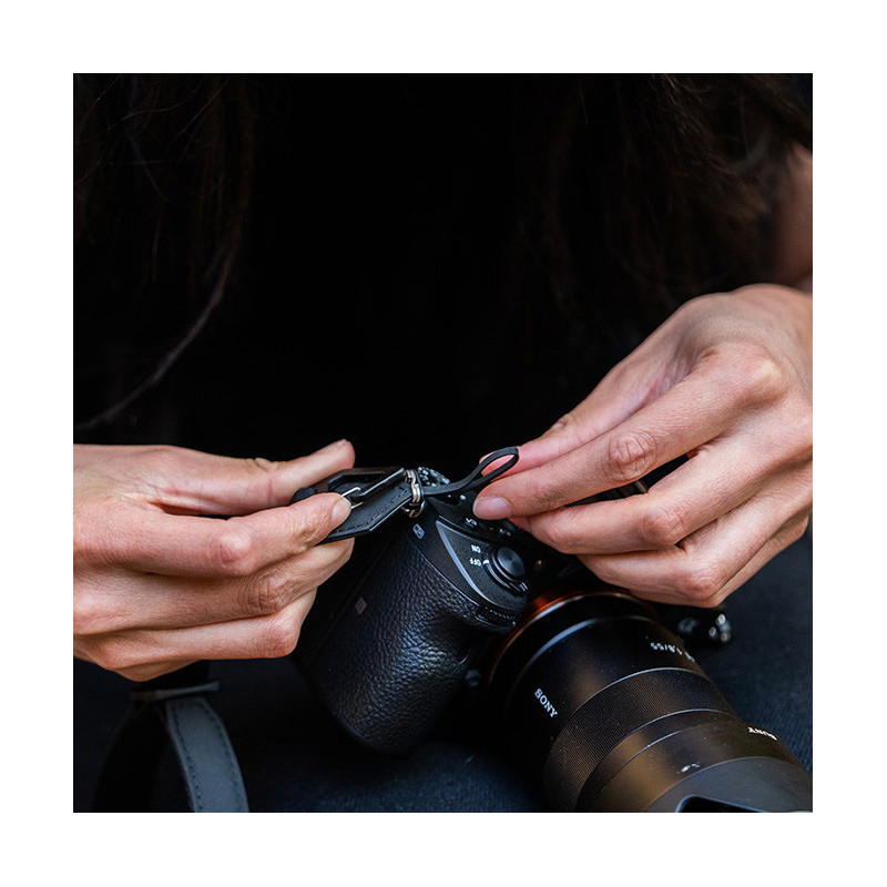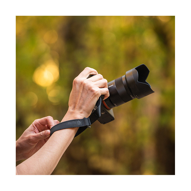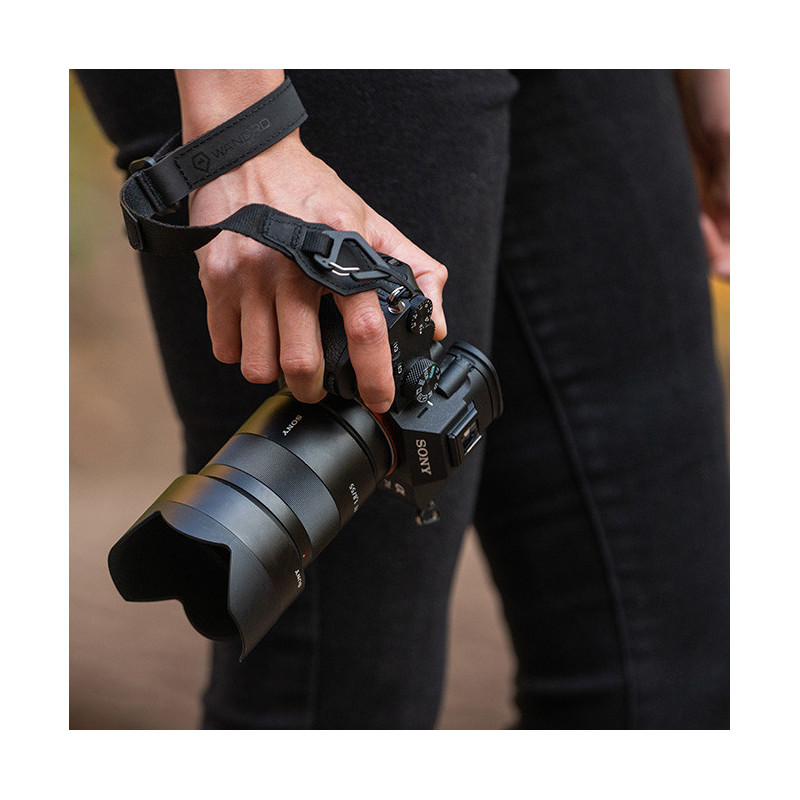 The WANDRD wrist strap attaches securely to any camera, providing a secure hold and protection against accidental drops. It features an adjustable design to fit any wrist size and an auto-lock system for added security.