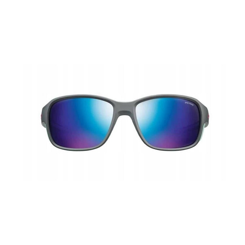 Photochromic lenses adapt to light conditions and provide 13% light transmission. The sunglasses have a gray and mint plastic frame, removable side covers and are suitable for unisex use in various sports.