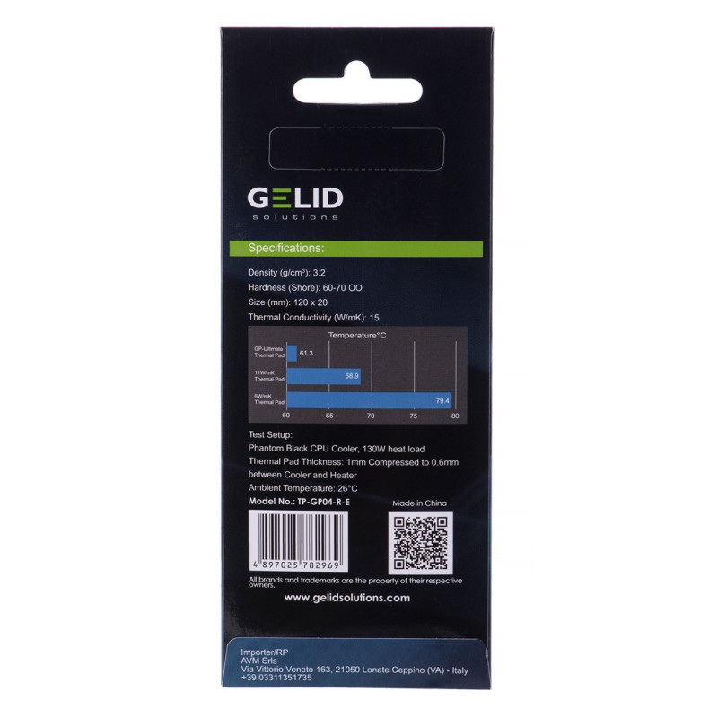 A thermal pad with dimensions of 120x20x3 mm and a density of 3.2 g/cm³ ensures efficient heat transfer.