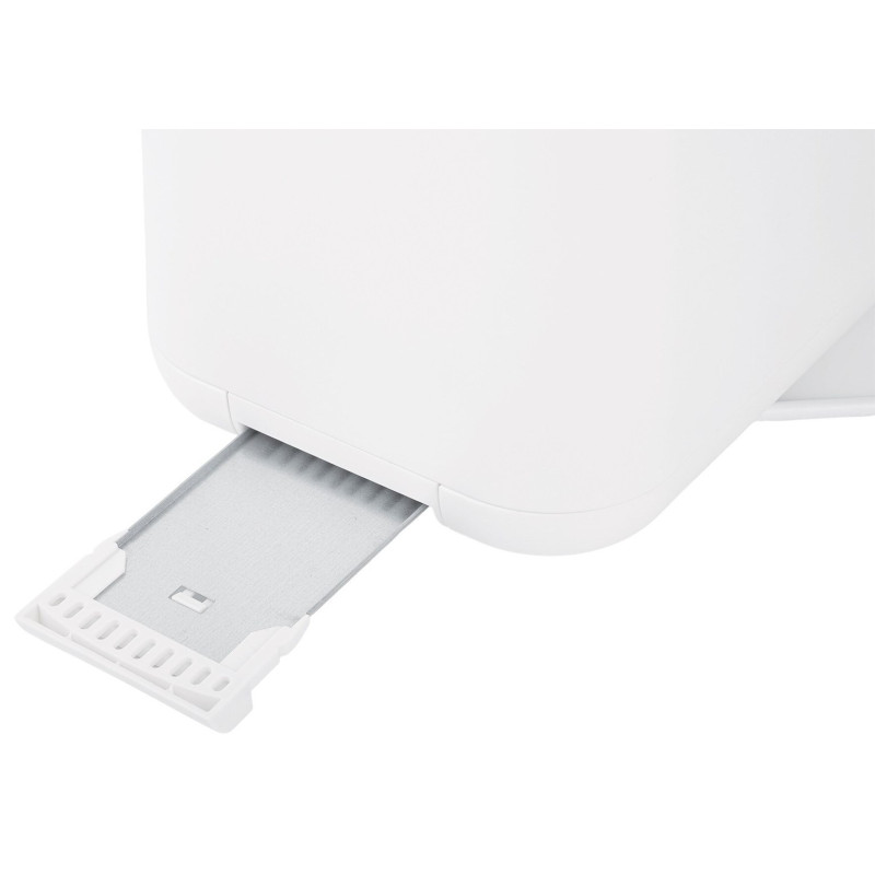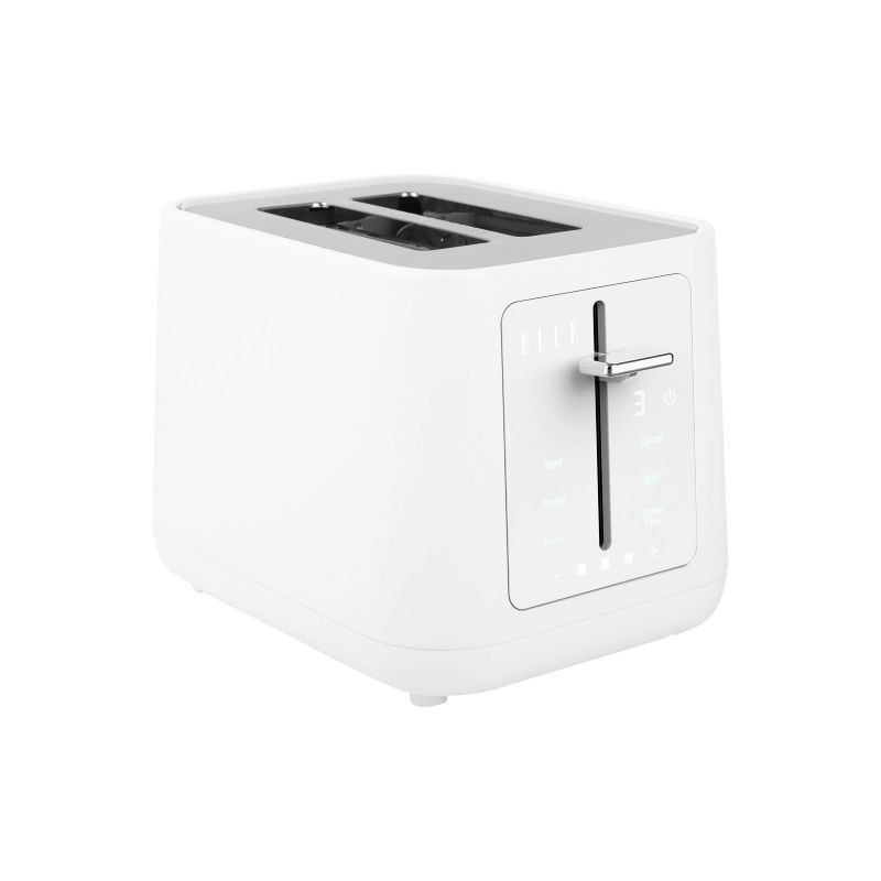 The ELLE white toaster has touch-sensitive controls with six browning levels and can toast two slices at a time. It has defrost and reheat functions, as well as a crumb tray for easy cleaning.