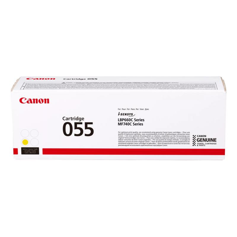Canon cartridge 055 yellow has a yield of 2,300 pages and is designed for use with Canon printers. The dimensions of the cartridge are 365 x 105 x 125 mm, it is an original toner unit.