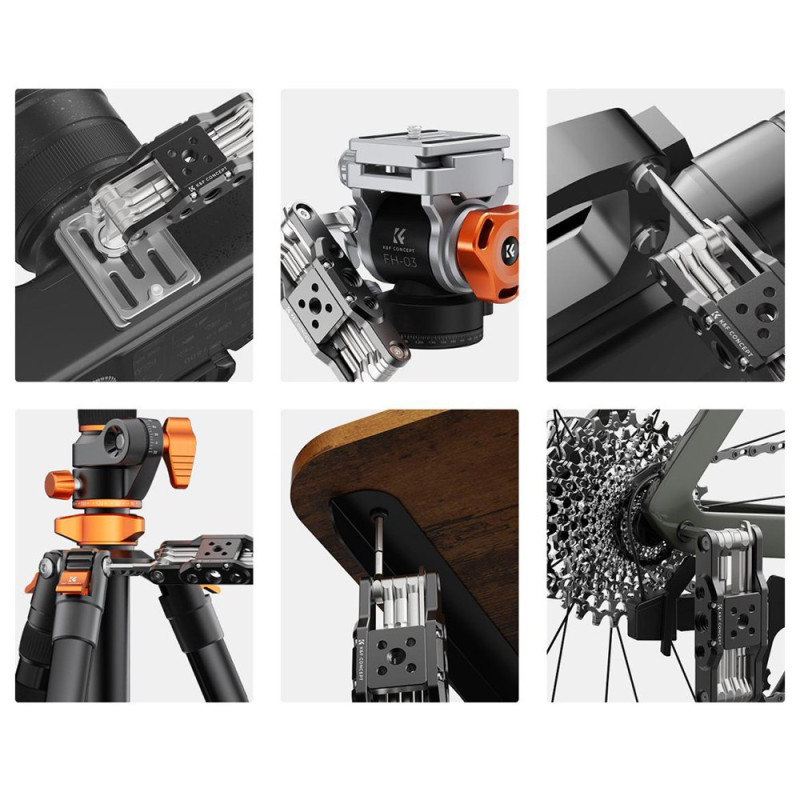 The KF Concept Multitool DJ05 is a compact 10-in-1 tool made of durable aluminum alloy, featuring six hex keys and four screwdrivers. It features 1/4' and 3/8' threads for spare screws and a belt hole for convenient transportation.