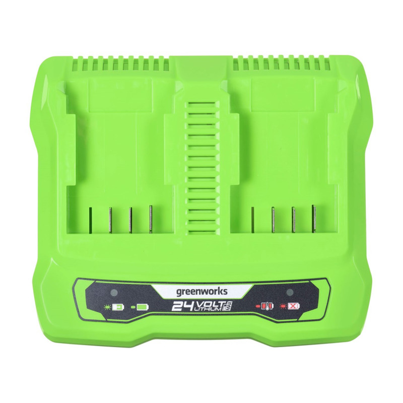 The GREENWORKS G24X2UC2 charger is designed to charge two Lithium-Ion batteries with a voltage of 24 V and a charging current of 4 A. It has a fast charging function and includes battery capacity indicators that allow you to monitor charge levels.