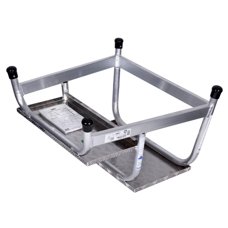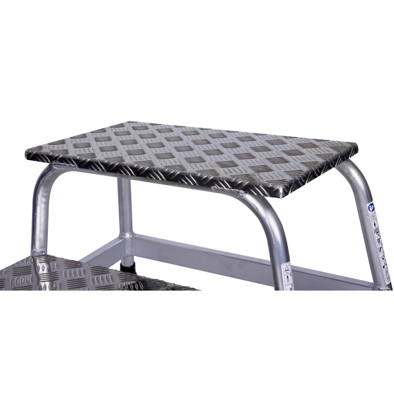 The Krause Stabilo Silver Ladder is a compact, 2-tier work platform designed for safe and efficient work. Made of sturdy aluminum, it features non-slip feet and a tool storage tray.