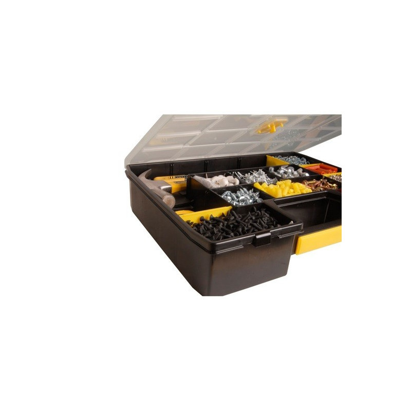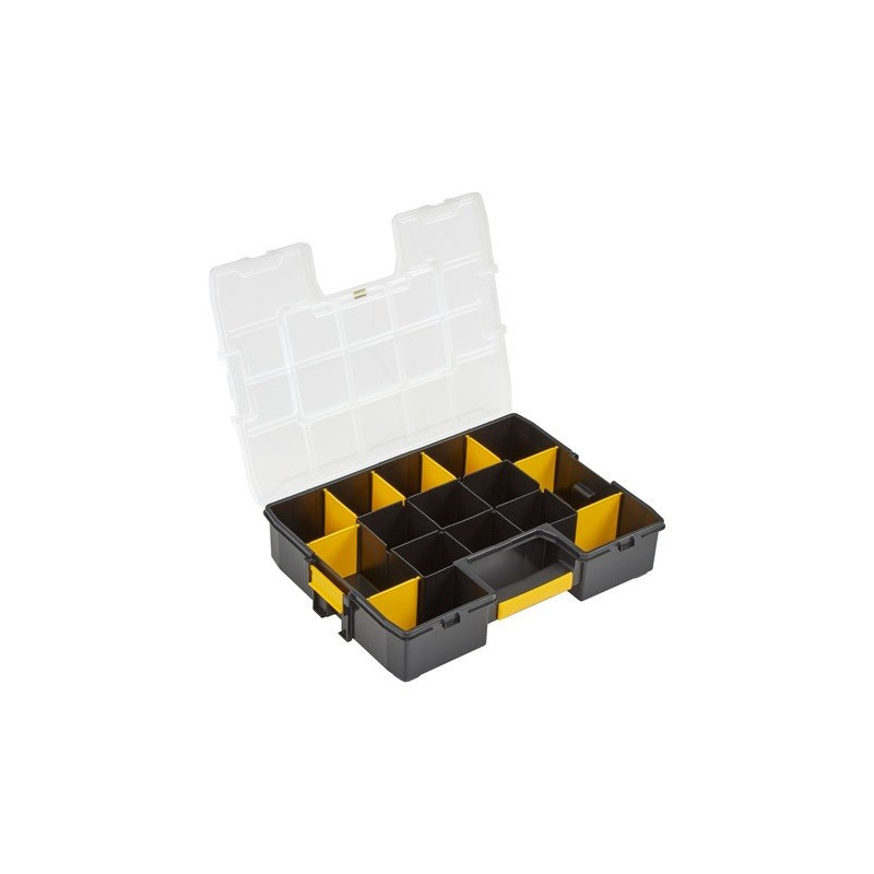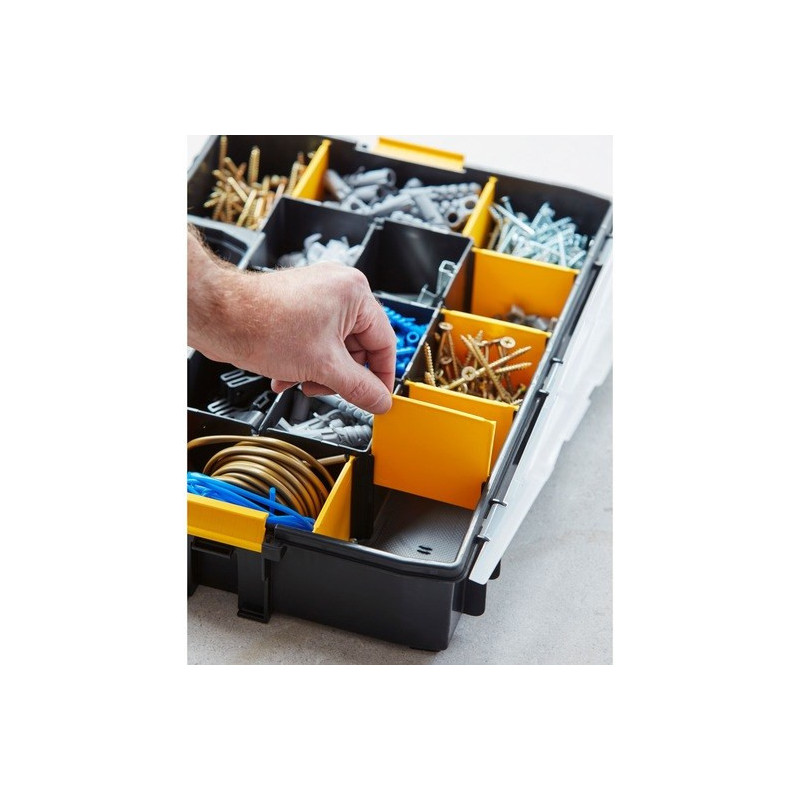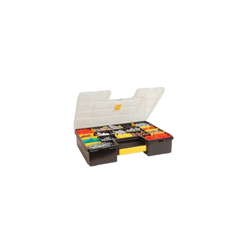 The Stanley CUBIX Sort Master Organizer is a small parts box designed to organize a variety of small items. It has a lift-up lid and a single handle for easy transport, and its dimensions are 90 mm wide, 430 mm deep and 330 mm high.