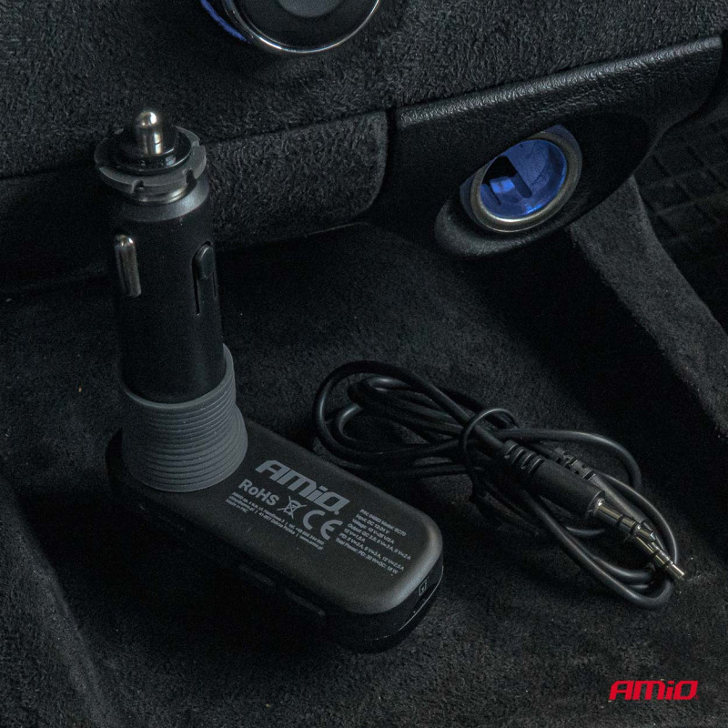 Car FM transmitter 2×USB-A 1×USB-C mircoSD 12V 24V AMIO-04653