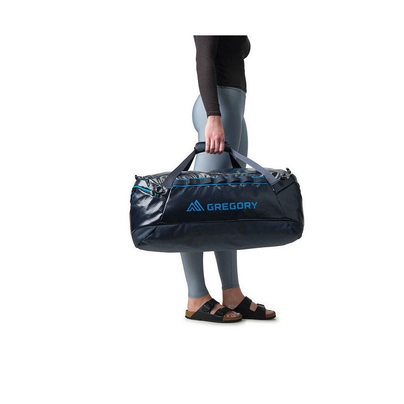 GREGORY ALPACA 60 L TRAVEL BAG features a waterproof design, a padded and adjustable shoulder strap, and multiple pockets for organization. It has a capacity of 60 liters and is made of durable polyester and TPU.