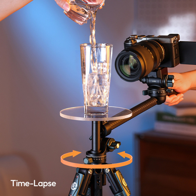 The QT05 Xiaojiu turntable allows for smooth 360-degree rotation, perfect for photography and videography. It features a quick release system, secure O-ring lock, and is compatible with a variety of cameras, supporting a load of up to 3 kg.