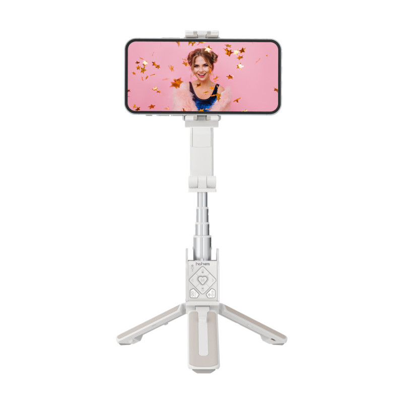 The iSteady Q White is a versatile smartphone stabilizer that can function as a selfie stick or a tabletop holder. It features face tracking, a detachable remote control, and supports various shooting modes via the Hohem Joy app.