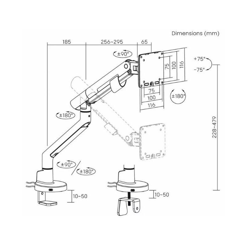 | Warnings | Do not exceed the maximum user weight recommended by the manufacturer., Regularly check the fixings and tighten screws as necessary to prevent the monitor/TV from falling., Ensure that the holder is mounted on the correct wall/desk according to the manufacturer's instructions. |