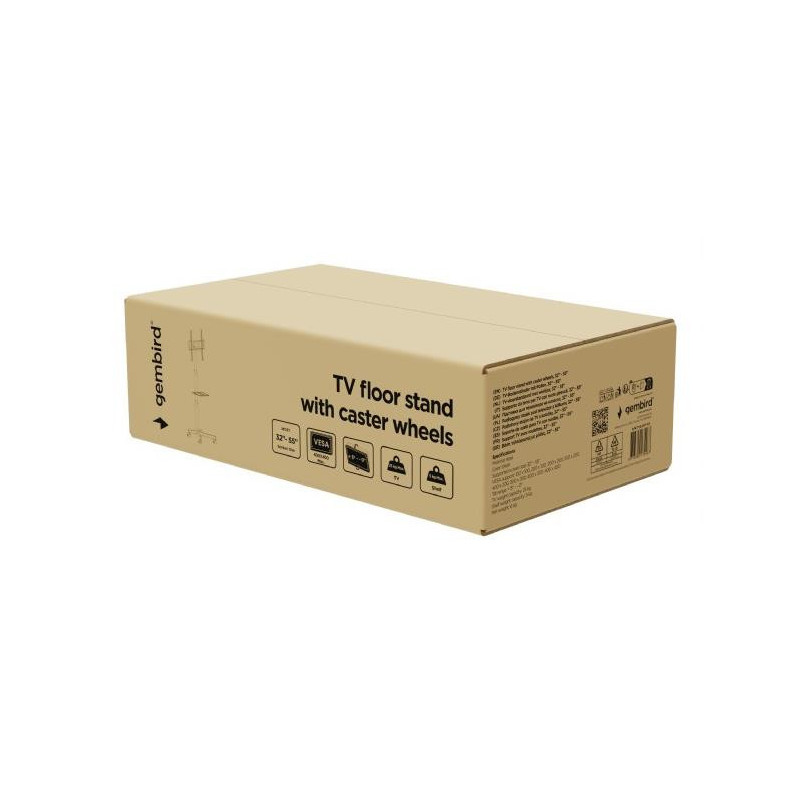 | Summary | Gembird TV floor stand with caster wheels (tilt), 32" - 55". Maximum weight capacity: 30 kg, Minimum screen size: 81.3 cm (32"), Maximum screen size: 139.7 cm (55"), Minimum VESA mount: 100 x 100 mm, Maximum VESA mount: 400 x 400 mm. Tilt angle range: -5 - 0°. Product colour: Black |