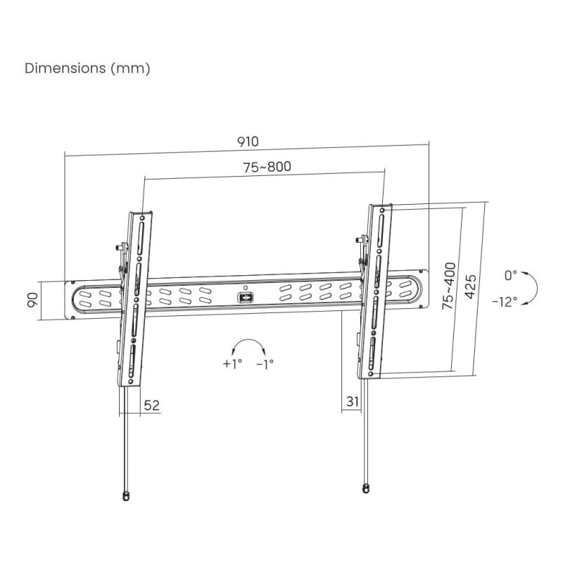 | Summary | Gembird PRO series. Maximum weight capacity: 60 kg, Minimum screen size: 109.2 cm (43"), Maximum screen size: 2.41 m (95"), Minimum VESA mount: 200 x 200 mm, Maximum VESA mount: 800 x 400 mm. Tilt angle range: 0 - 12°, Distance to the wall (max): 3.1 cm. Product colour: Black |