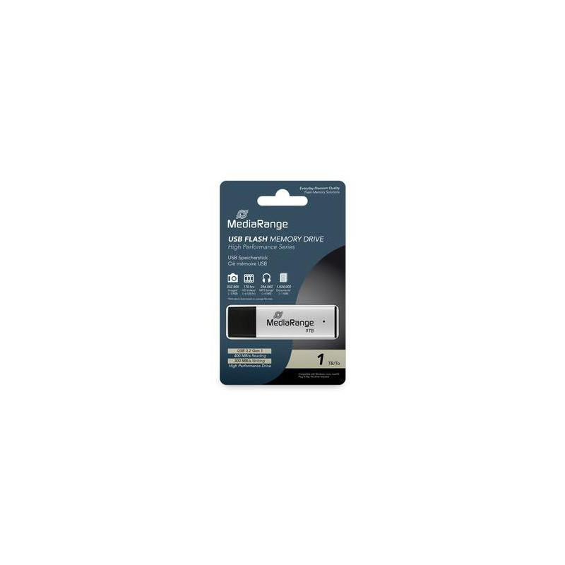 | Summary | MediaRange MR1905-1. Capacity: 1 TB, Device interface: USB Type-A, USB version: 3.2 Gen 1 (3.1 Gen 1), Read speed: 400 MB/s, Write speed: 300 MB/s. Form factor: Cap. Weight: 15 g. Product colour: Black, Silver |