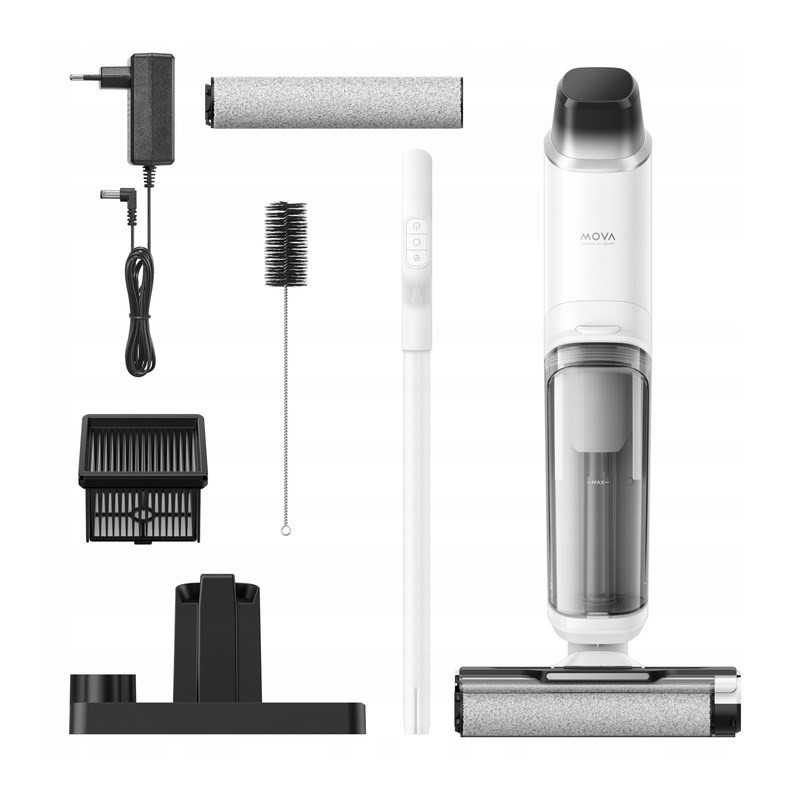 The Mova Dreame K10 Pro upright vacuum cleaner has a bagless design with a 0.6 L dirty water tank and a 0.89 L clean water tank. It features a brushless motor, 30 minutes of run time, and offers dry and wet cleaning on carpets and hard floors.