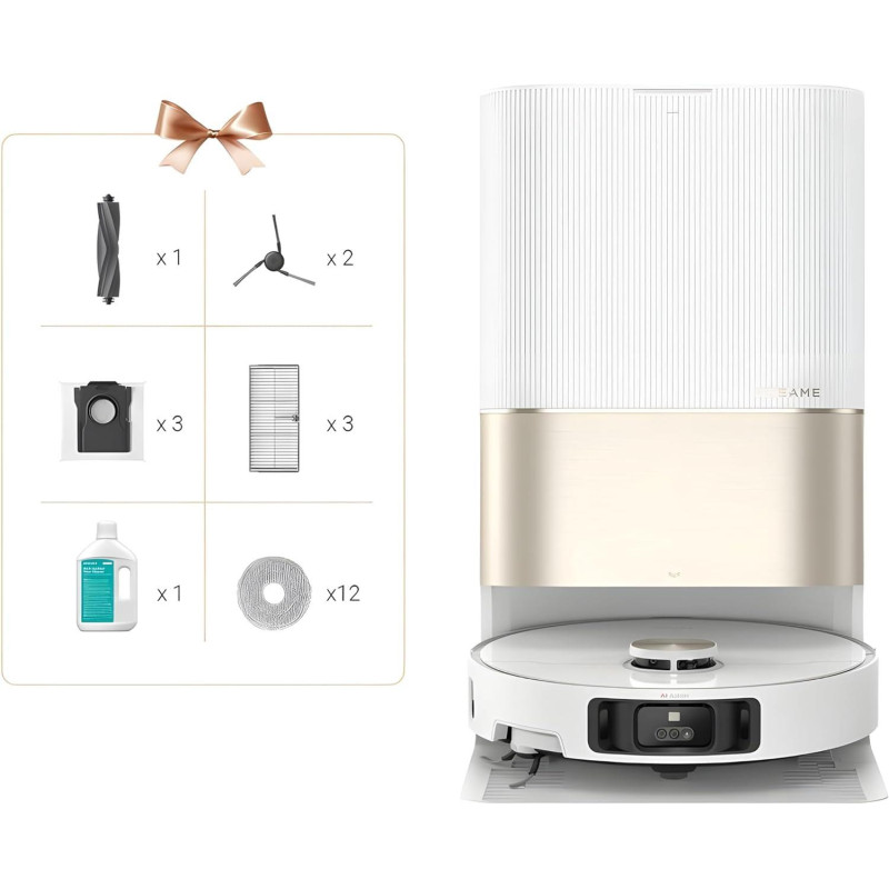 | Summary | Dreame X40 Ultra Complete. Dust container type: Bagless, Product colour: White, Shape: Round. Dust capacity (total): 0.3 L, Base station functions: Charging, Purification, Noise level: 76 dB. Battery technology: Lithium-Ion (Li-Ion), Battery capacity: 6400 mAh, Runtime: 180 min. Diameter: 35 cm, Height: 97 mm, Weight: 14.9 kg. Package width: 447 mm, Package depth: 490 mm, Package height: 642 mm |