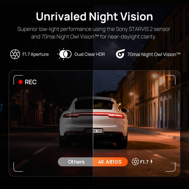 The 4K A810S delivers unparalleled night-time footage with Sony STARVIS 2 technology and 70mai Night Owl Vision. These features enhance exposure, reduce noise, and control glare, providing clear, balanced visuals when driving in low-light conditions.