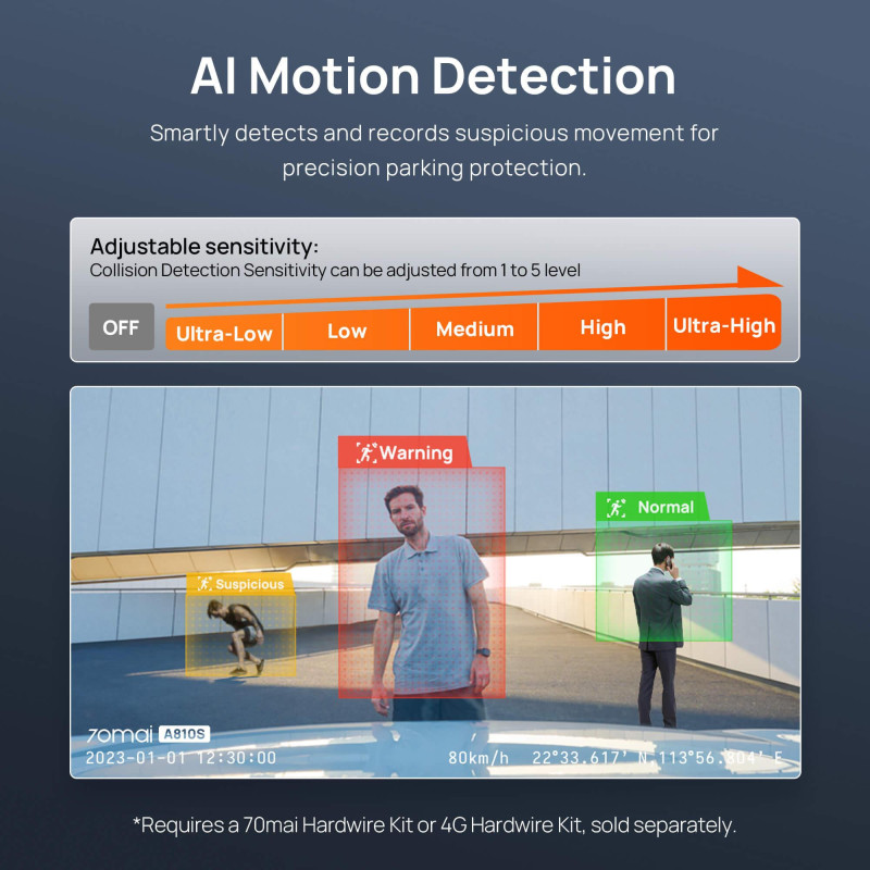 The 4K A810S features a buffered emergency recording function that captures up to 3 minutes of footage before a collision is detected, ensuring the full chain of events is preserved. It also includes a 5-level sensitivity G-sensor with customizable settings.