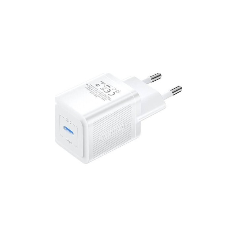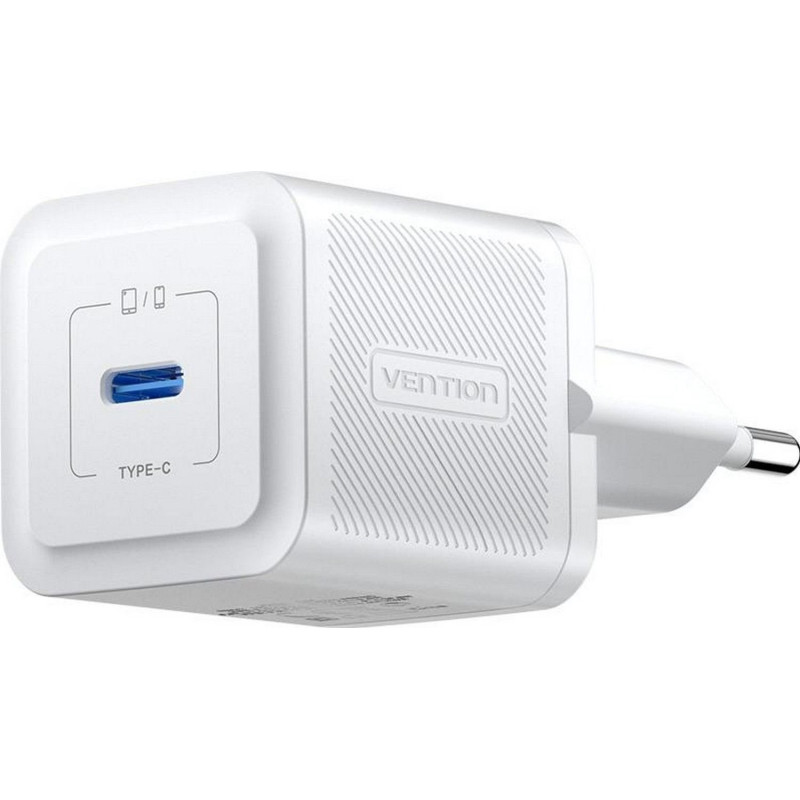 Vention USB-C 20W GaN Charger has one USB Type-C port and supports USB Power Delivery up to 20W. It operates with an input voltage of 100 to 240V.
