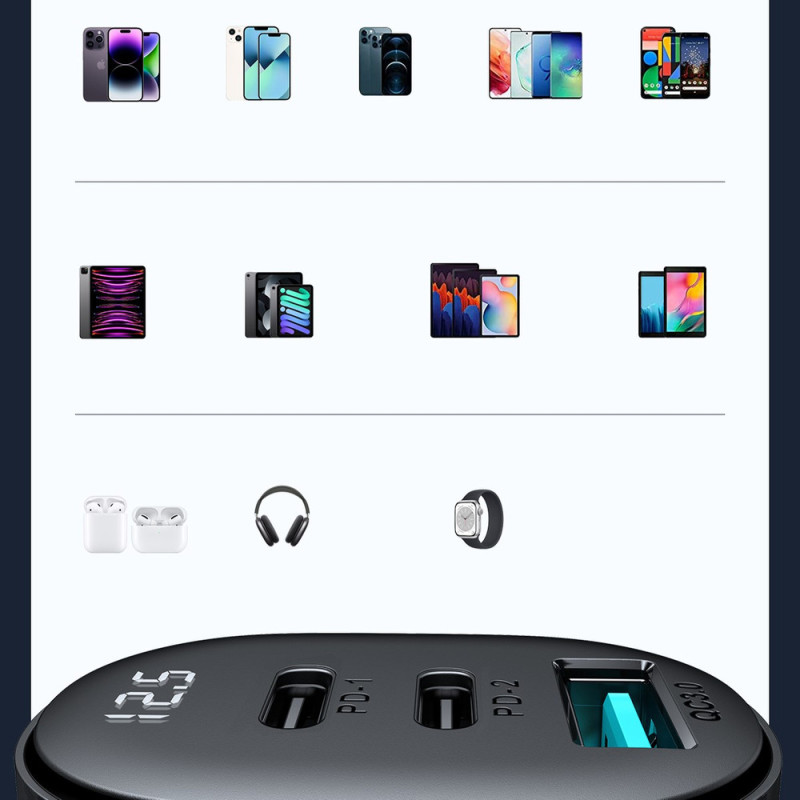 With three charging ports, you can power different devices at the same time. The charger is compatible with many devices and brands, which makes it an extremely universal solution for everyone.