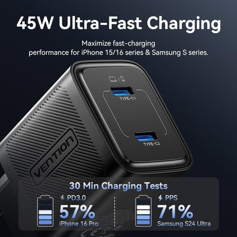 | Vendor Homepage | https://ventiontech.com/products/vention-2-port-usb-c-c-gan-charger-45w-45w-eu-plug-black?variant=46271940198566 |
