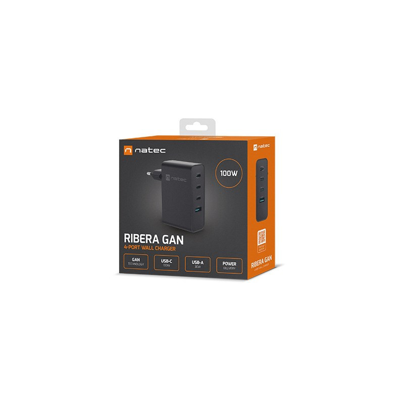 The NATEC NUC-2234 is a portable device charger designed for laptops and smartphones, featuring 3 USB Type-C ports and 1 USB Type-A port. It supports fast charging with a maximum output of 100W and includes safety features such as over-current and short-circuit protection.