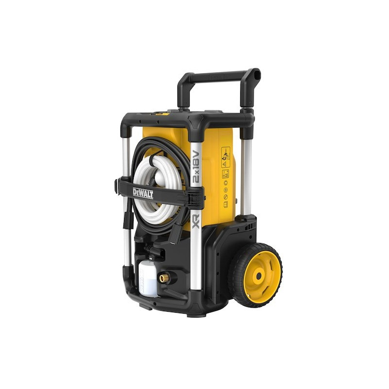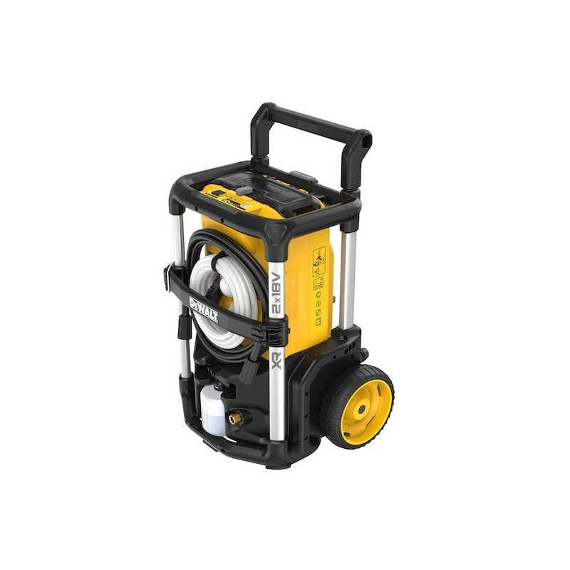 The DeWALT DCMPW1600N-XJ is a compact battery-powered high-pressure washer with a maximum working pressure of 110 bar. It has a 0.6 L detergent tank and a 12 Ah battery capacity, providing up to 63 minutes of run time.