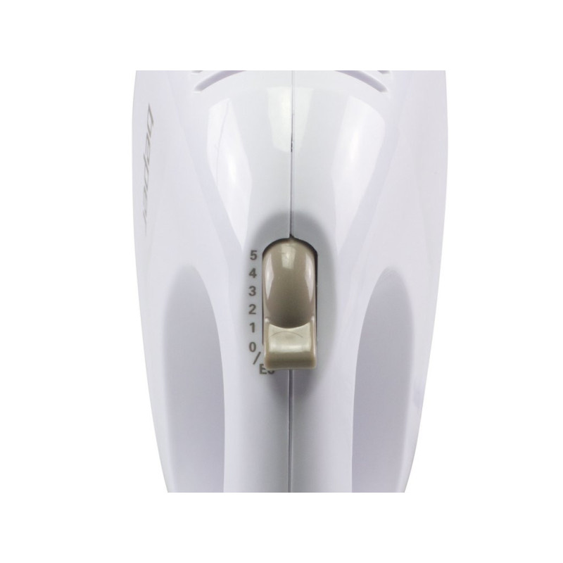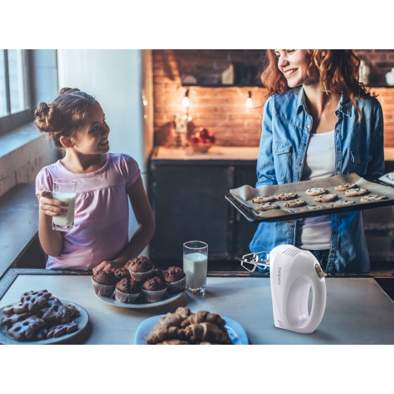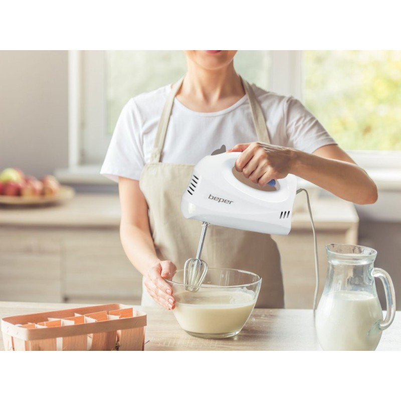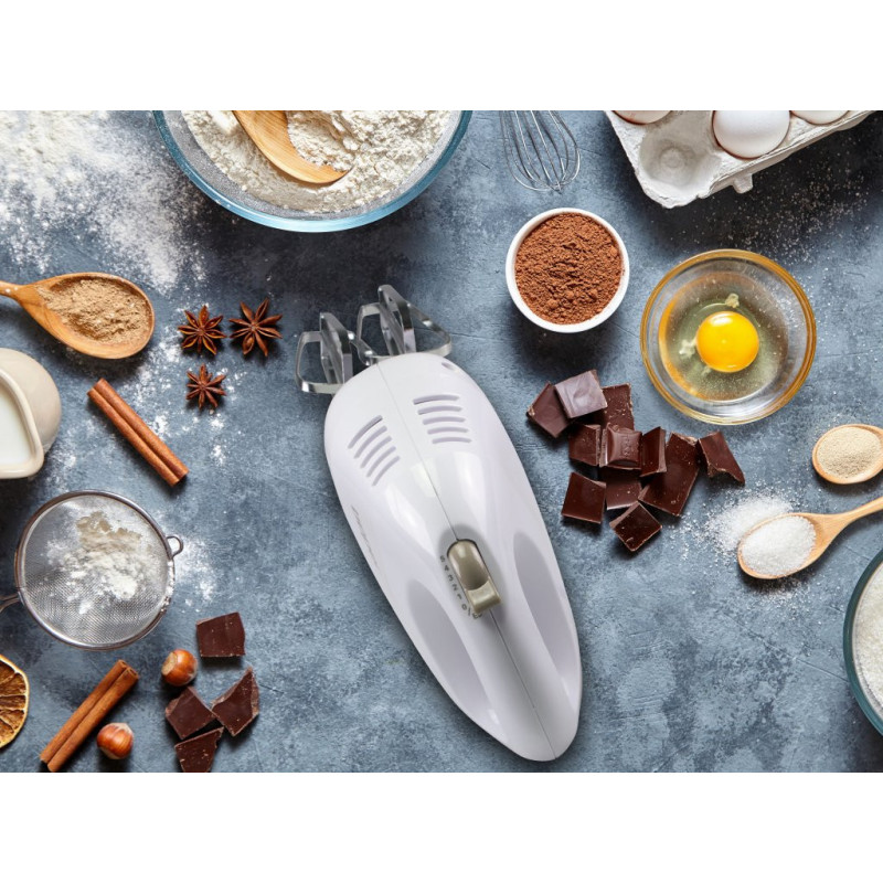 Lightweight electric hand mixer, ideal for whipping eggs and mixing creams and sweets. The mixer has 5 selectable speeds and a pair of stainless steel whisks for whipping and mixing are supplied. The whips are removable using the whisk release button and dishwasher safe. Ergonomic handle for easy grip.