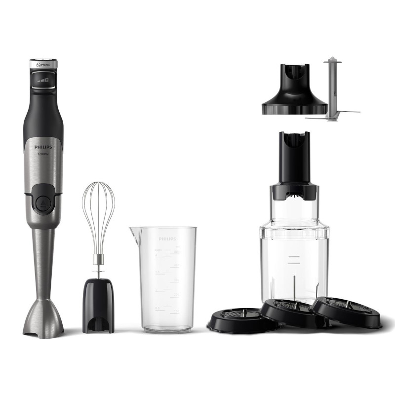 | Summary | Philips 5000 series HR2684/00 Hand Blender. Type: Immersion blender, Product colour: Stainless steel, Black, Cord length: 1.2 m. Rotational speed (max): 15000 RPM, Speed control type: Stepless, Control type: Buttons. Blending bowl material: Styrene Acrylonitrile (SAN), Housing material: Plastic, Blade material: Stainless steel. Power: 1200 W, Power source: AC, AC input voltage: 230 V. Width: 62 mm, Depth: 72 mm, Height: 409 mm |