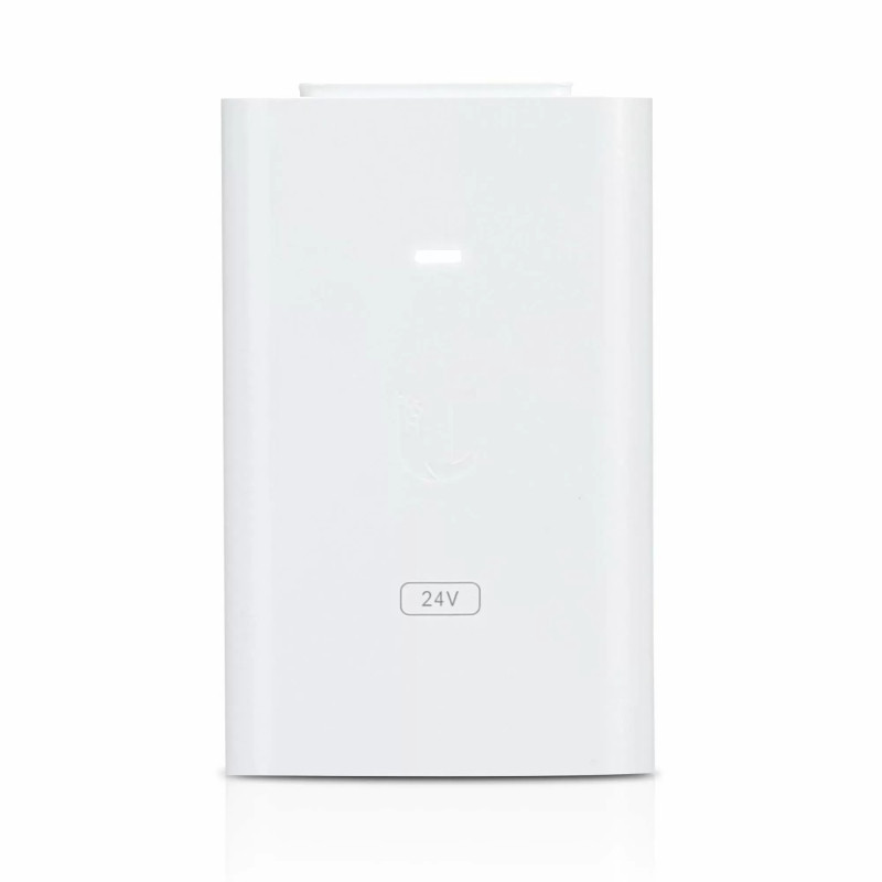The Ubiquiti POE-24-12W-G-WH is a high-efficiency Power over Ethernet (PoE) adapter designed to deliver stable power and data connectivity to Ubiquiti devices via a single Ethernet cable. This adapter is engineered to support Ubiquiti products requiring 24V passive PoE, making it a critical component for both indoor and outdoor network installations. This adapter operates with a universal input voltage range of 100-240V AC at 50/60 Hz, allowing it to be used with power systems worldwide. It converts the AC input into a steady 24V DC output at 0.5A, providing a total power output of 12W. This ensures that the connected devices receive consistent power necessary for their optimal operation.