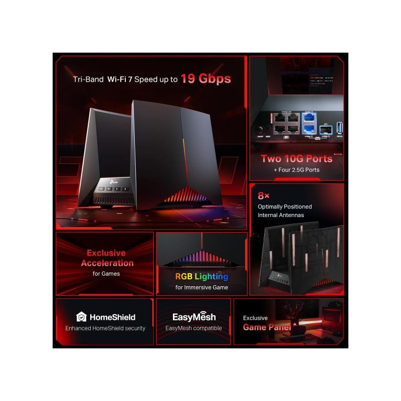 | Summary | TP-Link Archer BE19000 Tri-Band Wi-Fi 7 Gaming Router. WAN connection type: RJ-45. Wi-Fi band: Tri-band (2.4 GHz / 5 GHz / 6 GHz), Top Wi-Fi standard: Wi-Fi 7 (802.11be), WLAN data transfer rate (max): 11520 Mbit/s. Ethernet LAN interface type: 10 Gigabit Ethernet, Ethernet LAN data rates: 10,100,1000,1200,10000 Mbit/s, Networking standards: IEEE 802.11a, IEEE 802.11ac, IEEE 802.11ax, IEEE 802.11be, IEEE 802.11n, IEEE 802.1x. Fiber optic connector: SFP+. Security algorithms: WPA, WPA-Enterprise, WPA2, WPA2-Enterprise, WPA3, Firewall security: SPI Firewall |