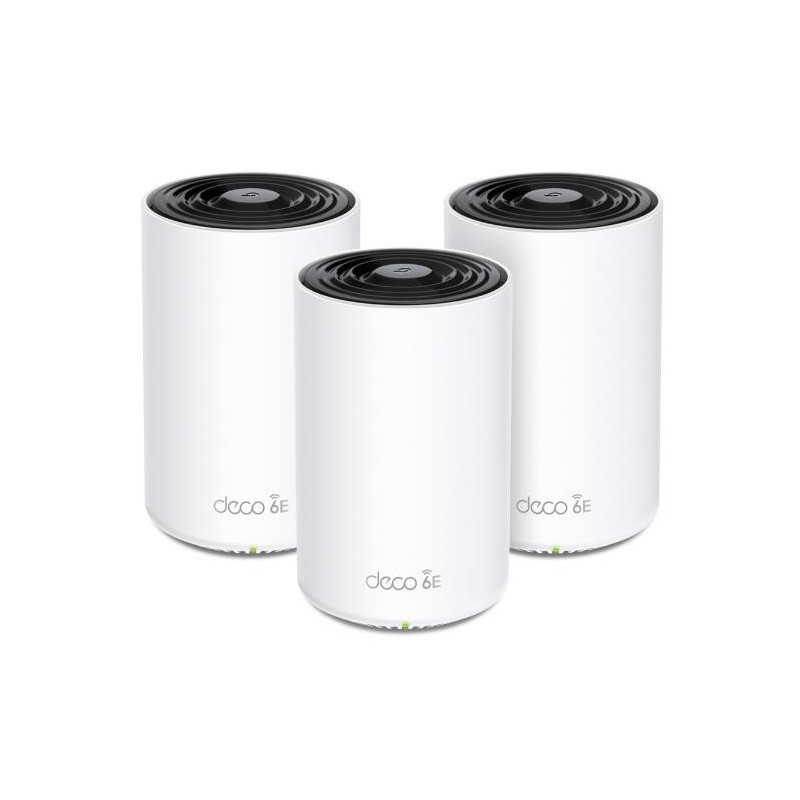 | Summary | TP-Link AXE5400 Tri-Band Mesh Wi-Fi 6E System, 3-Pack. Product colour: White, Antenna type: Internal, Maximum coverage: 670 m². Wi-Fi band: Tri-band (2.4 GHz / 5 GHz / 6 GHz), Top Wi-Fi standard: Wi-Fi 6E (802.11ax), Wi-Fi standards: 802.11a, 802.11b, 802.11g, Wi-Fi 4 (802.11n), Wi-Fi 5 (802.11ac), Wi-Fi 6 (802.11ax), Wi-Fi 6E.... Processor frequency: 1.7 GHz, Virtual assistant: Amazon Alexa, Cloud services supported: TP-Link ID. Compliance certificates: CE, RoHS. Width: 105 mm, Depth: 105 mm, Height: 169 mm |
