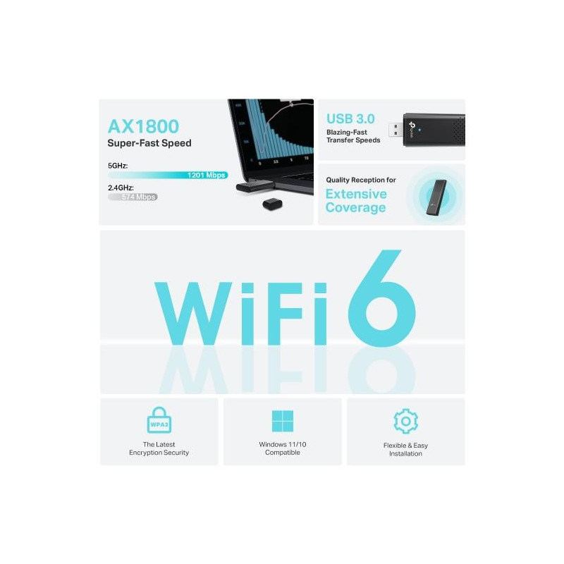 | Summary | TP-Link Archer AX1800 Dual Band Wi-Fi 6 USB Adapter. Connectivity technology: Wired, Host interface: USB, Interface: WLAN. Maximum data transfer rate: 1201 Mbit/s, Top Wi-Fi standard: Wi-Fi 6 (802.11ax), Wi-Fi band: Dual-band (2.4 GHz / 5 GHz). Product colour: Black |