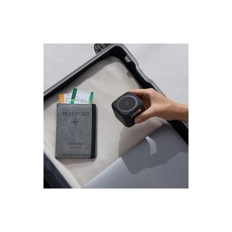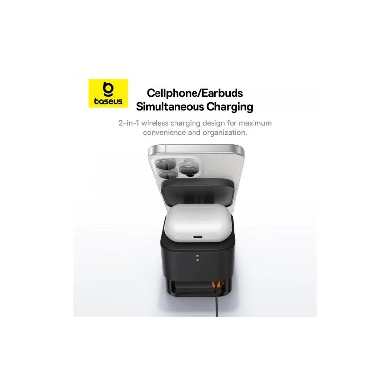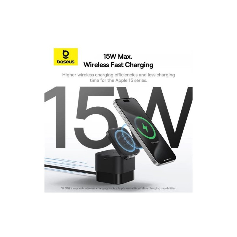 The modern Baseus BS-W531 magnetic charger allows you to charge three devices simultaneously. It features a built-in, retractable cable that significantly saves space. Its small size and low weight make it easy to take the Baseus BS-W531 charger with you on any trip. Compatible devices include iPhone, AirPods, and Apple Watch. The charger protects your device against overheating, overvoltage, overload, short circuit, and other potential electrical hazards.