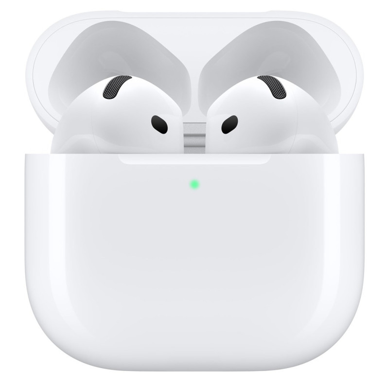 Apple AirPods (4th generation) feature a lightweight design with a built-in battery that provides up to 30 hours of audio playback with the charging case. They are sweat, water, and dust resistant, have touch controls, and use Bluetooth 5.3 for wireless connectivity.