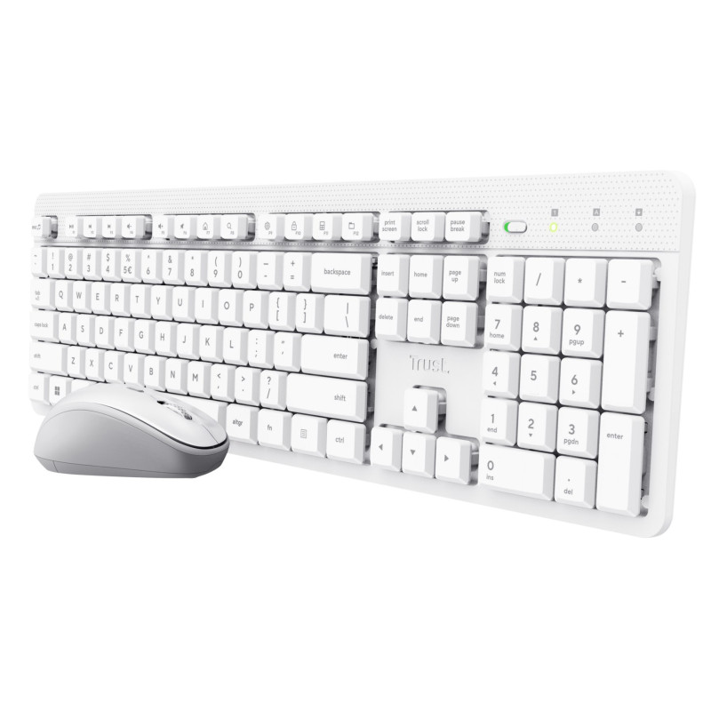 Wireless keyboard and mouse set in white, spill-resistant, with adjustable keyboard height. Compatible with Windows, Mac OS and ChromeOS, has a full-size layout and a 1600 DPI optical mouse.