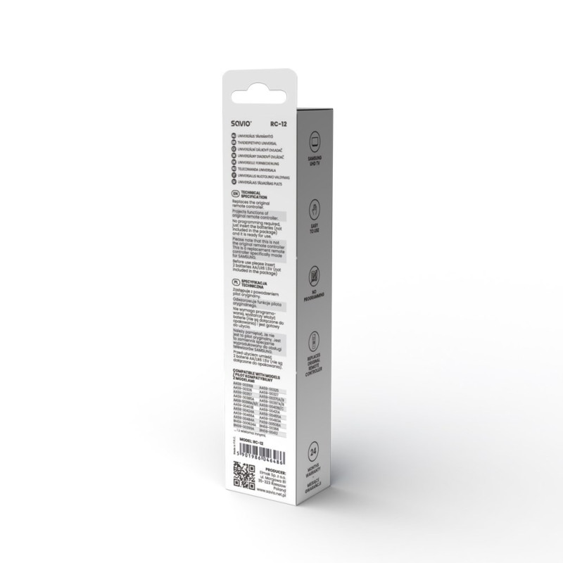 The Savio RC-12 is a remote control specially designed for Samsung TVs. It features IR wireless technology for convenient and efficient control.