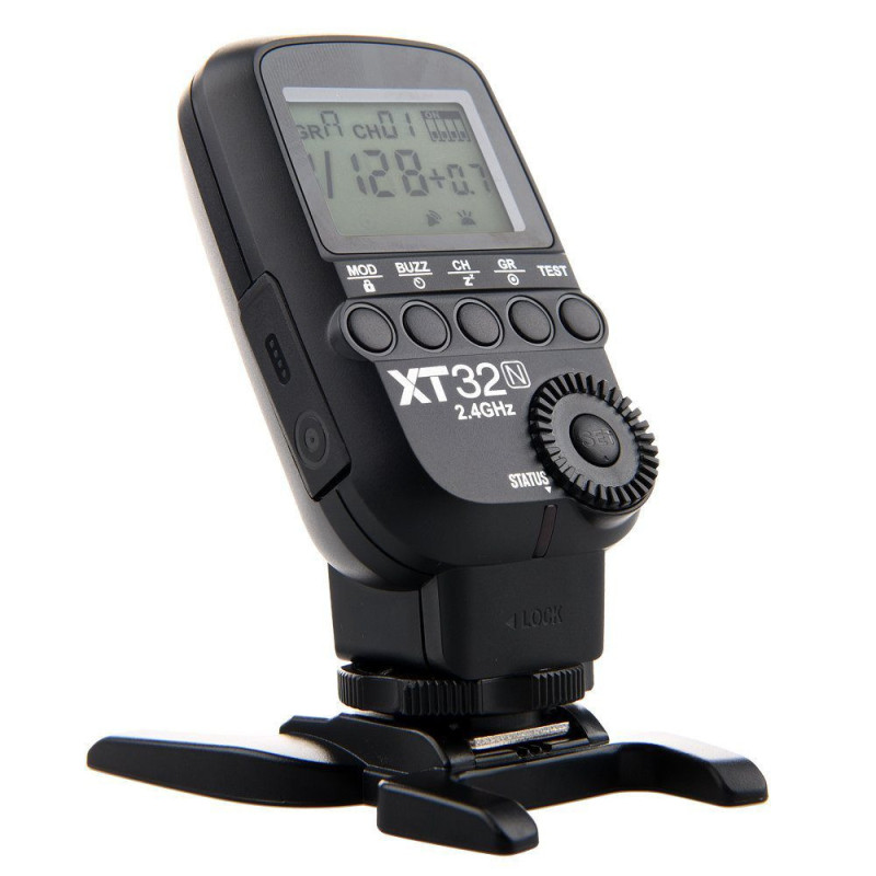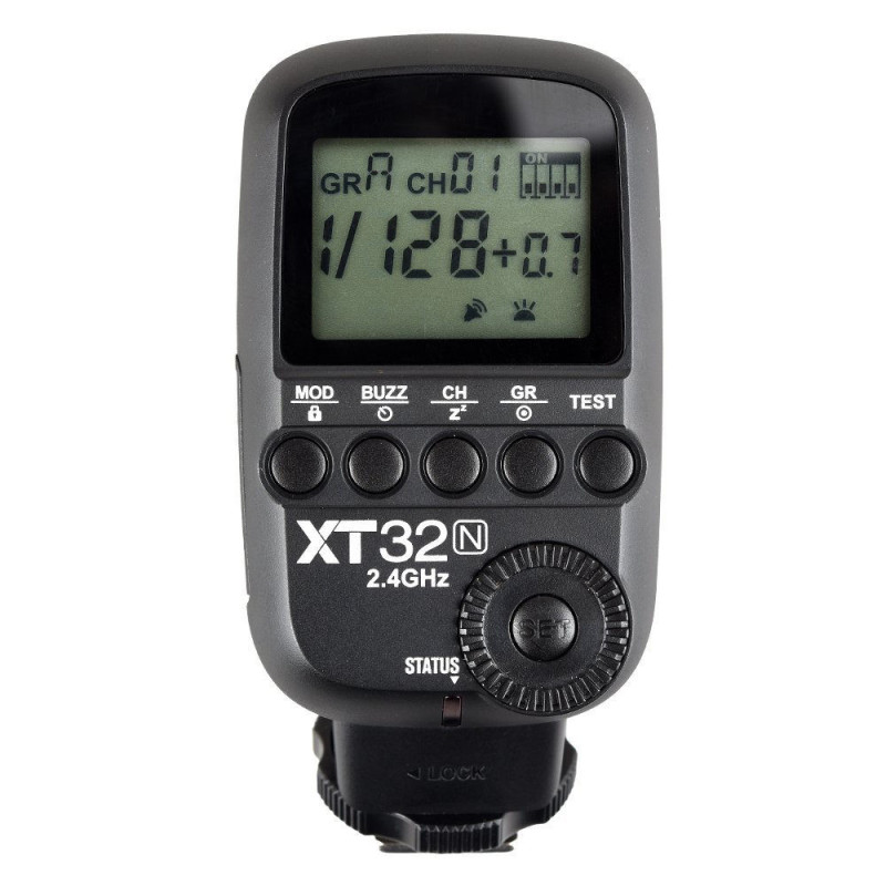 The Godox XT 32C transmitter allows you to remotely control external flashes and adjust the brightness of the model's light. It supports high-speed sync, has a range of 100 meters, and offers 16 groups and 32 channels for various lighting solutions.