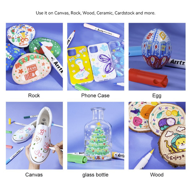 High-quality, non-washable acrylic markers ARRTX are designed for drawing on various surfaces, such as paper, cardboard, canvas, fabric of various compositions, glass, ceramics, plastic, wood, stone and others.