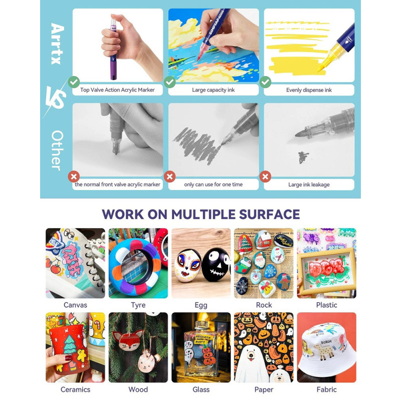 Usage:1. Shake well before use to mix the pigment evenly. 2. With the tip pointing down, press the marker clip on the top 4-5 times until the paint fills the tip. You can watch the paint flow down through the window in the body. 3. Close the cap tightly after use.Notes: The markers are water-based, so colors may vary slightly depending on the surface used. For best results, it is recommended to store them horizontally and close the caps immediately after use to prevent evaporation.