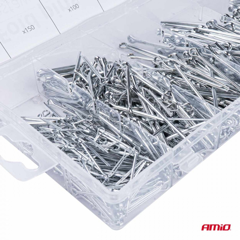 A set of high-quality cotter pins. They are used in workshops and service centers, intended for mechanics and DIY enthusiasts. Packaged and sorted in a plastic case, these pins are used to prevent slippage of components mounted on shafts, axles, spindles, or screws.