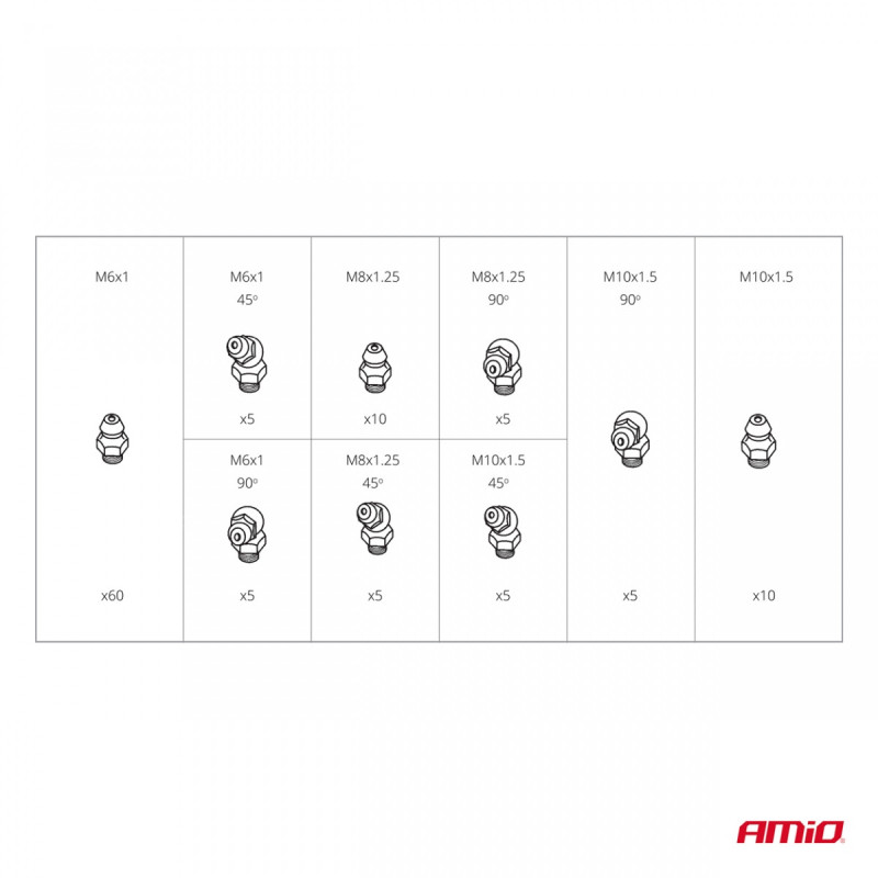 The set includes straight, 45 degree and 90 degree grease nipples with M6, M8, and M10 threads.
