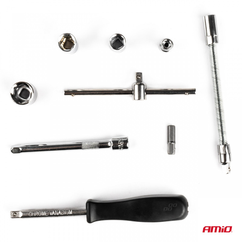 The socket wrench set consists of 46 pieces made of high-quality chrome-vanadium steel.