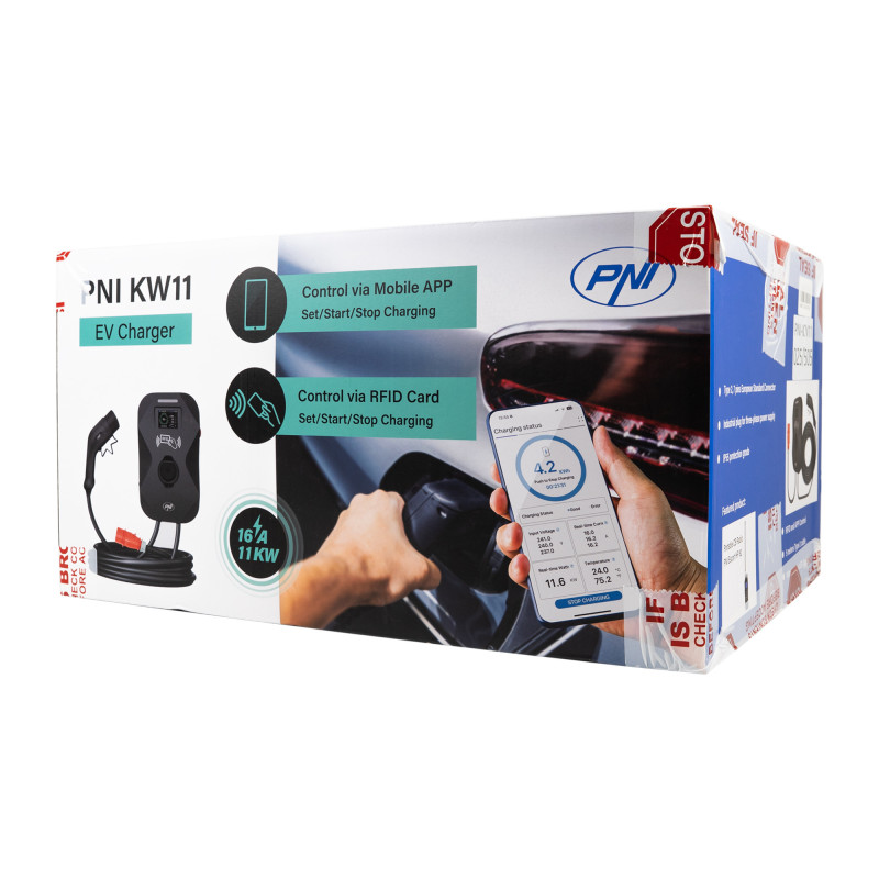 PNI KW11 16A 11KW elektromobilių įkrovimo stotelė, 380 V - 440 V trifazė, 2 tipo jungtis, ekranas, kortelė, BT, valdymas iš mobiliosios programėlės BT + RFID + APP