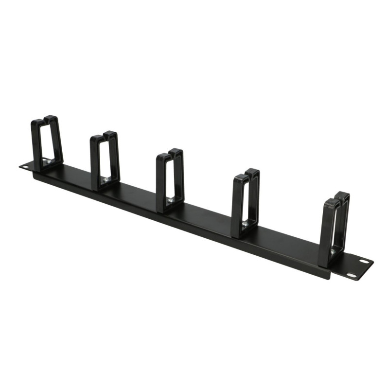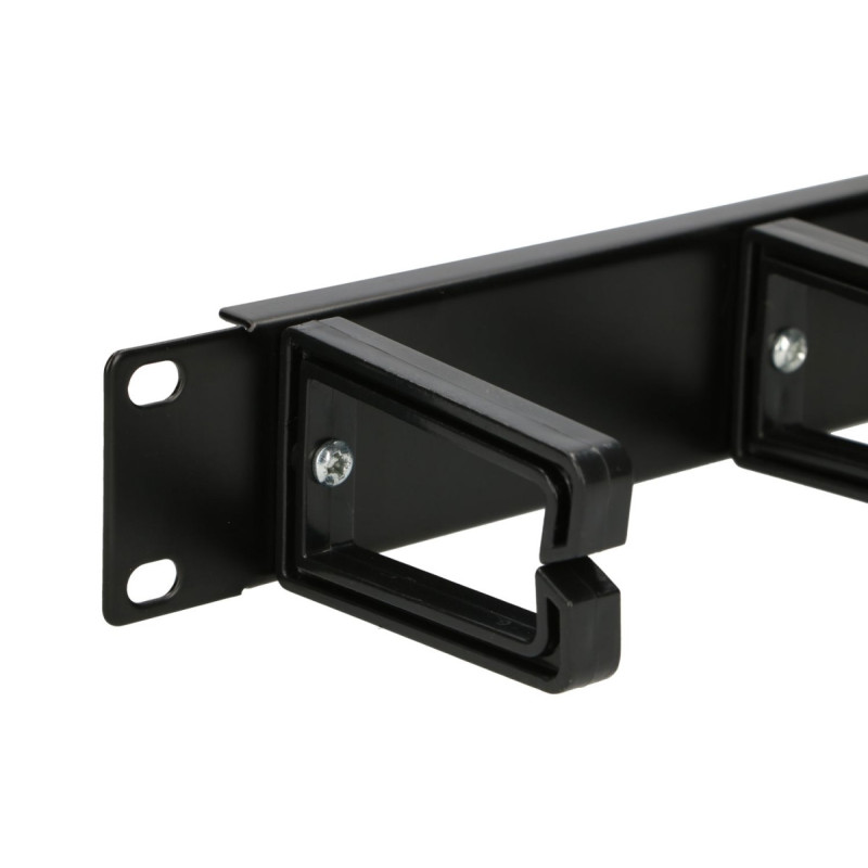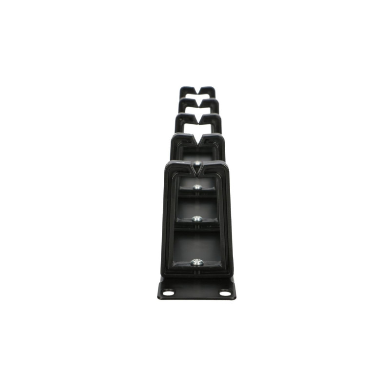 Cable organizer designed for 19' racks, allows to run patchcords connecting individual network components like switch or patchpanel. Similarly to many network devices, it is mounted to rack rails and occupies 1U. It is equipped with 5 plastic supports that allow easy cable entry. Organizer allows you to run horizontal cables from one side of the rack to the other or aesthetically arrange the cables coming out of the active device ports. It can be used with both copper and fiber optic cables.