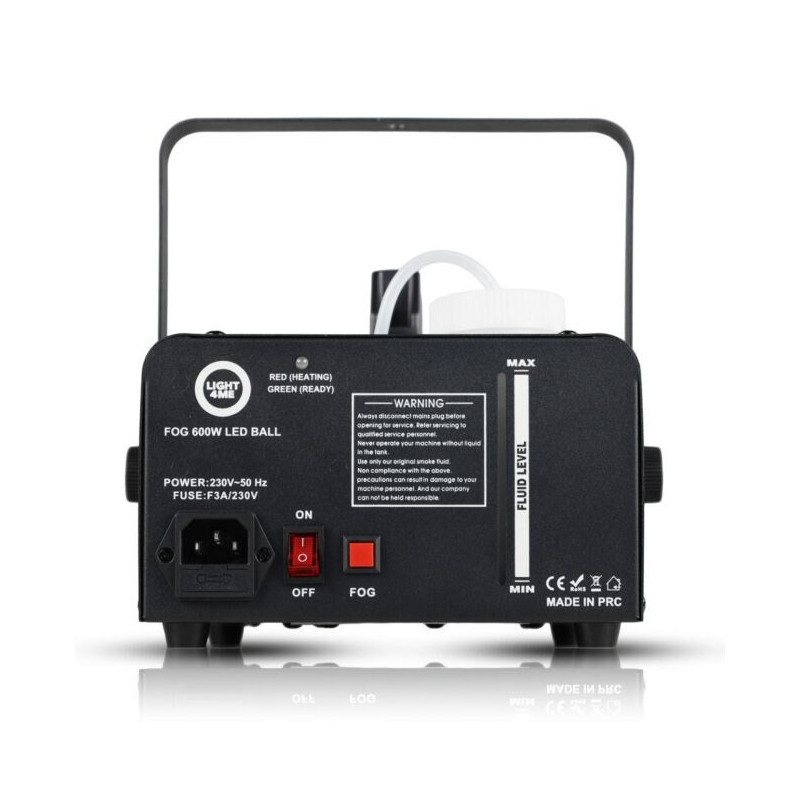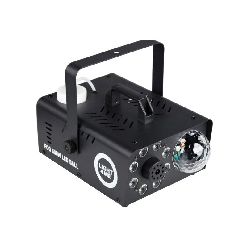 LIGHT4ME Fog 600W LED Ball yra dūmų ir rūko mašina, kuri generuoja rūką 50 m³/min greičiu. Ji turi 0,25 L skysčio talpą ir yra komplektuojama su nuotolinio valdymo pultu.