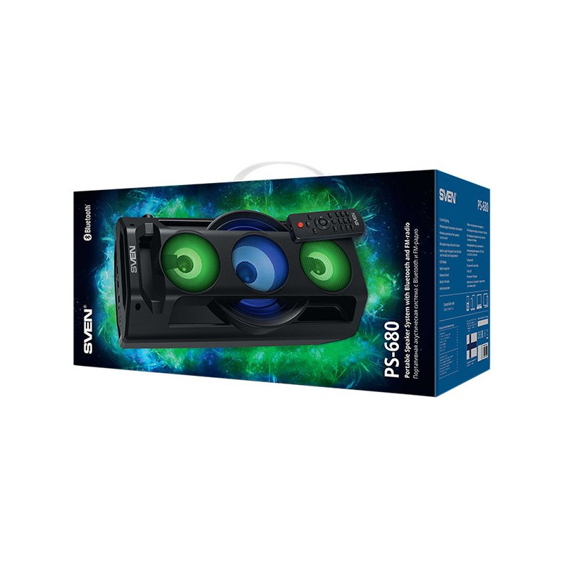 SVEN PS-680 2x32,5W; LED ekranas; TWS; FM radijas; AUX; USB/SD kortelės palaikymas;Apšvietimas; Mikrofono įvestis (karaoke); Nuotolinio valdymo pultas; Integruotas ekvalaizeris