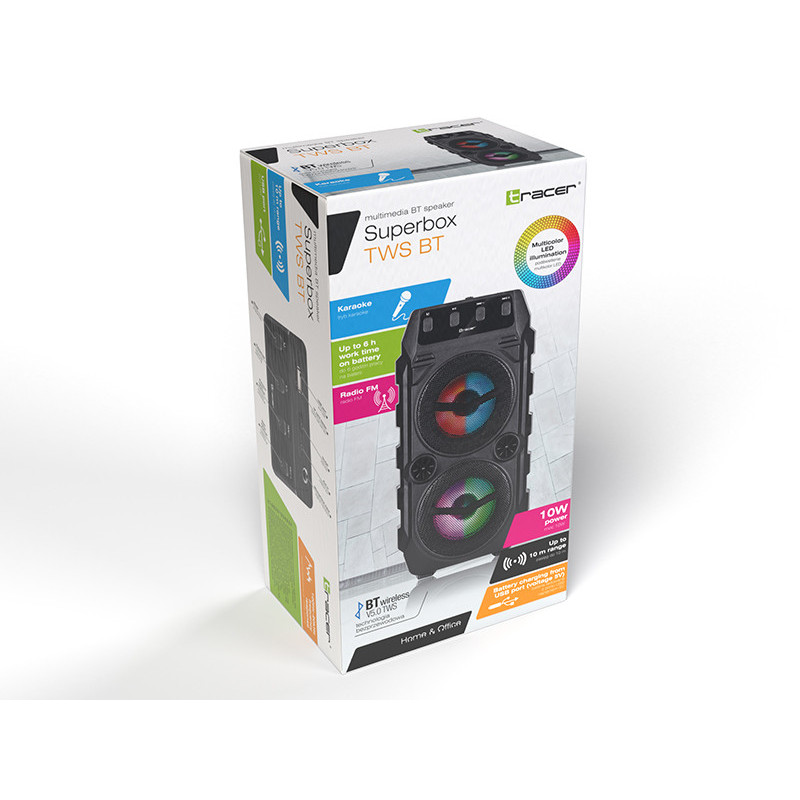 „Tracer Superbox“ – tai aukštos kokybės belaidis garsiakalbis, kurio galia siekia 10 W. Šis įrenginys sukurtas tiems, kurie mėgsta galingą garsą ir aiškius bosus. Klausykitės mėgstamos muzikos iš „Bluetooth“ įrenginių – planšetinių kompiuterių, išmaniųjų telefonų, MP3 grotuvų ar nešiojamųjų kompiuterių – ir mėgaukitės belaidžiu veikimu bei nepriekaištingu garsu.