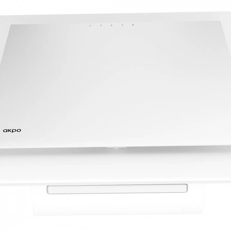 Ergonomiškas kamino gaubtas su baltu plieno ir grūdinto stiklo dizainu. Savybės: LED apšvietimas, maksimali ištraukimo galia 300 m³/h ir energijos efektyvumo klasė A.